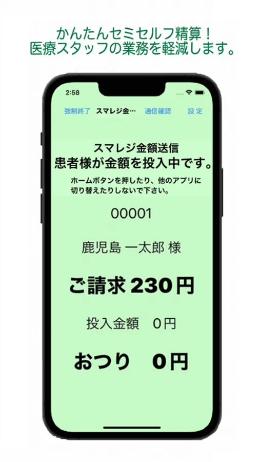 医療機関でのお会計時、患者様の請求金額・入金額・釣銭額を見やすく表示し、患者様側のiPadに送信します。