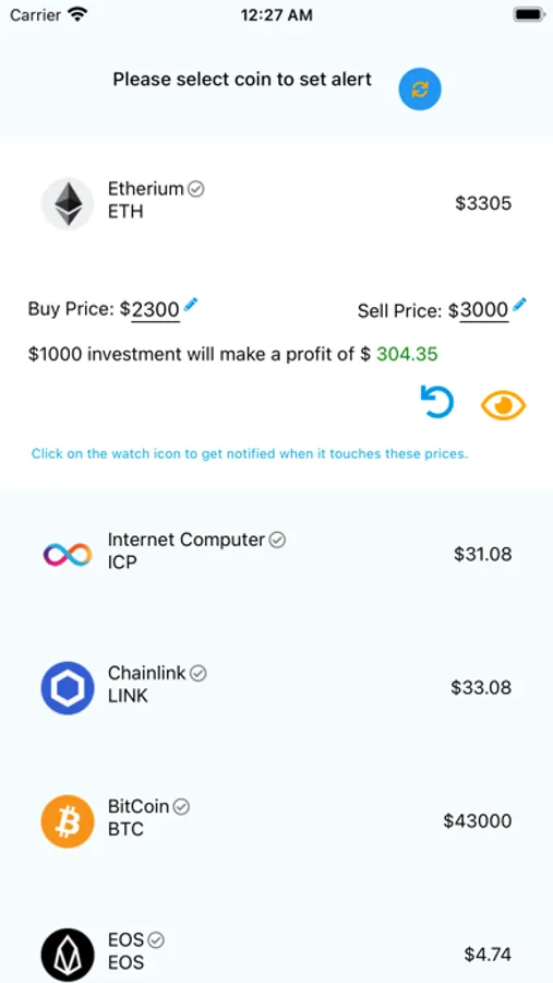 Setup your buy & sell alert price and save it. Get notified when the price touches those points. Use any investment app to buy & sell your coin. Cryptn will notify you when its again time to sell your coin.