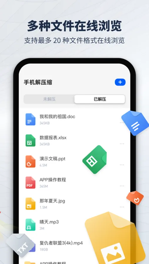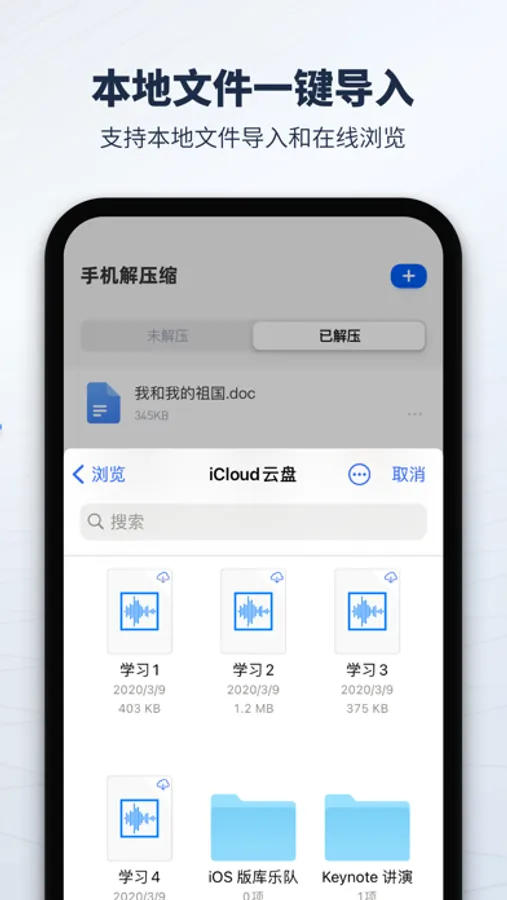 “手机解压缩”是一个综合的文件管理应用程序,主打压缩文件的解压功能,还支持各种类型文件的在线浏览,支持文件类型格式多达20多种,满足您日常工作所需。 设计简单易用,功能强大且稳定,并且也支持手机iCloud文件的导入,文件处理超方便。