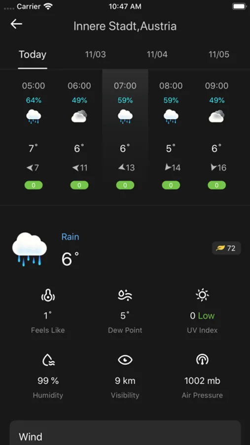 Detailed weather forecast information includes: weather conditions, today’s temperature, feels like temperature, dew point, rainfall, wind speed and wind direction, visibility, air quality index, UV index, sunrise and sunset time...