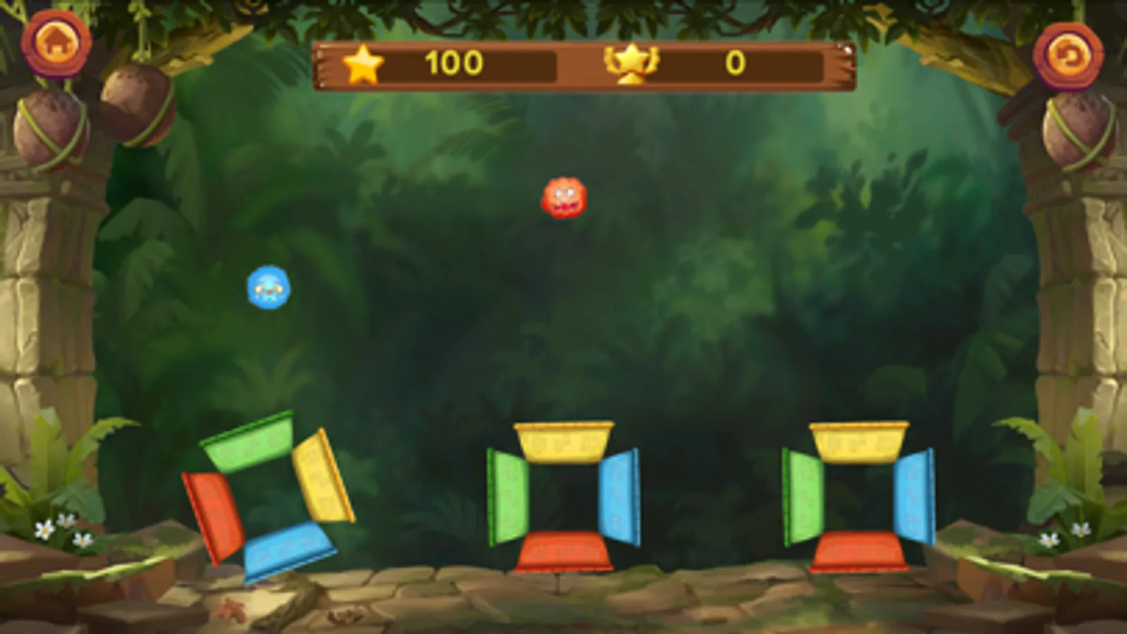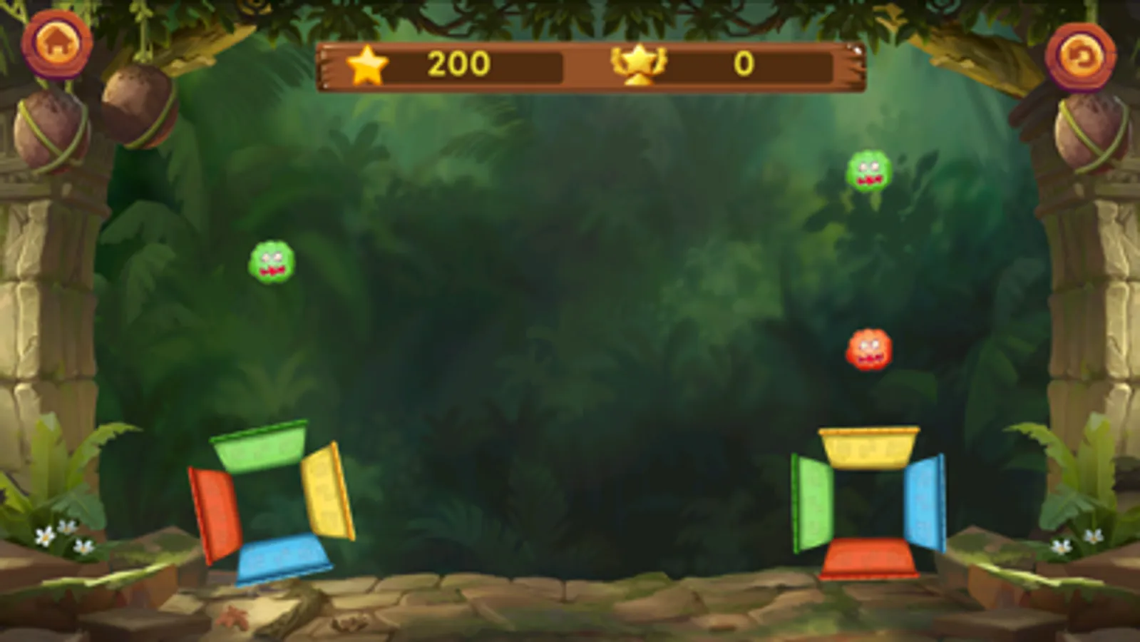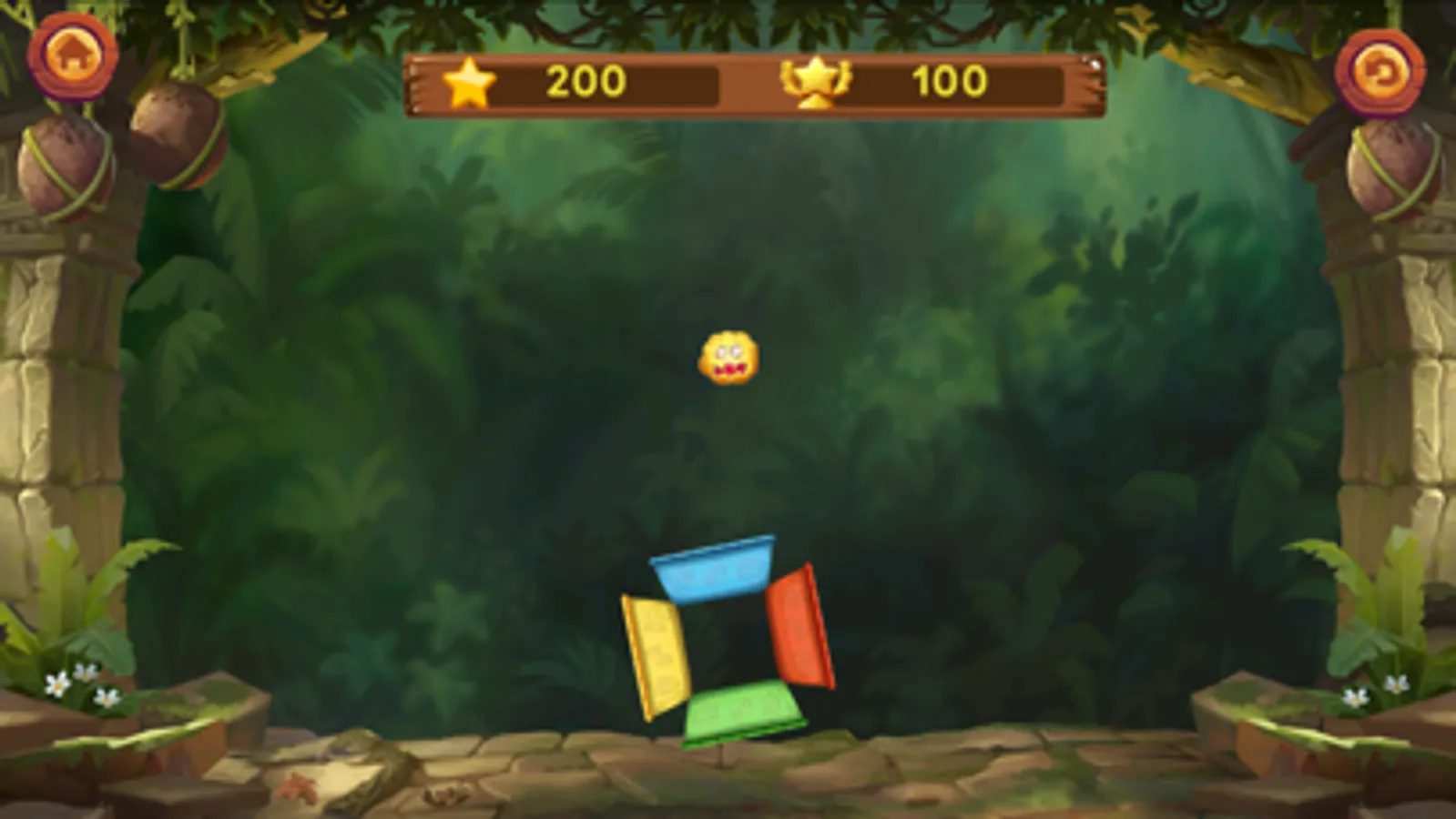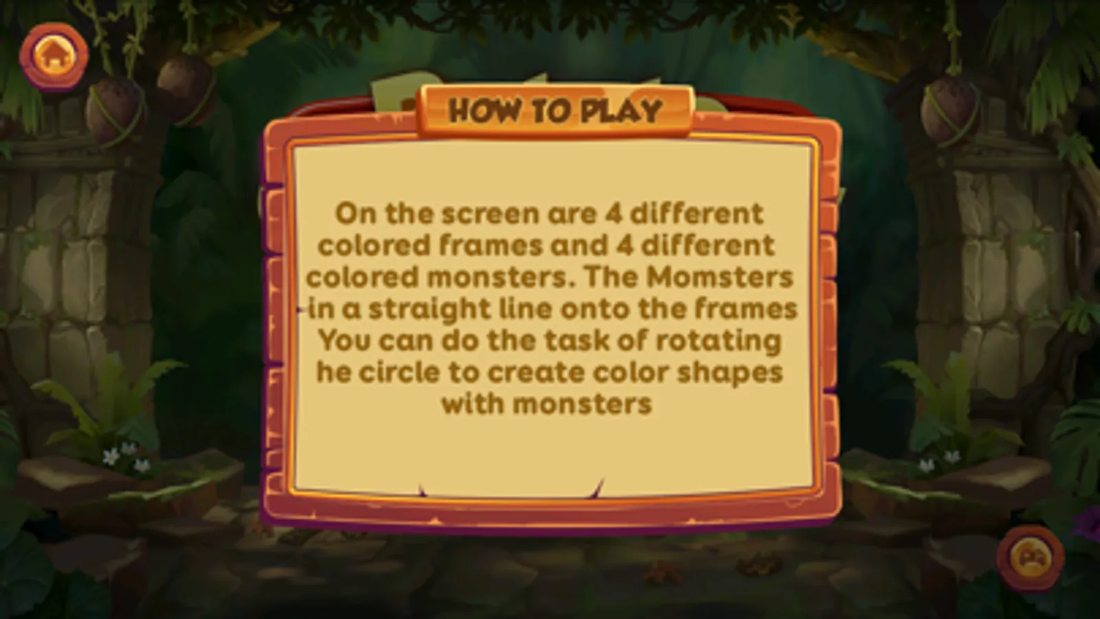 On the screen are 4 different colors and 4 monsters. The monsters fell in a straight line onto the frames. You can do the task of rotating the circle to create color shapes with monsters