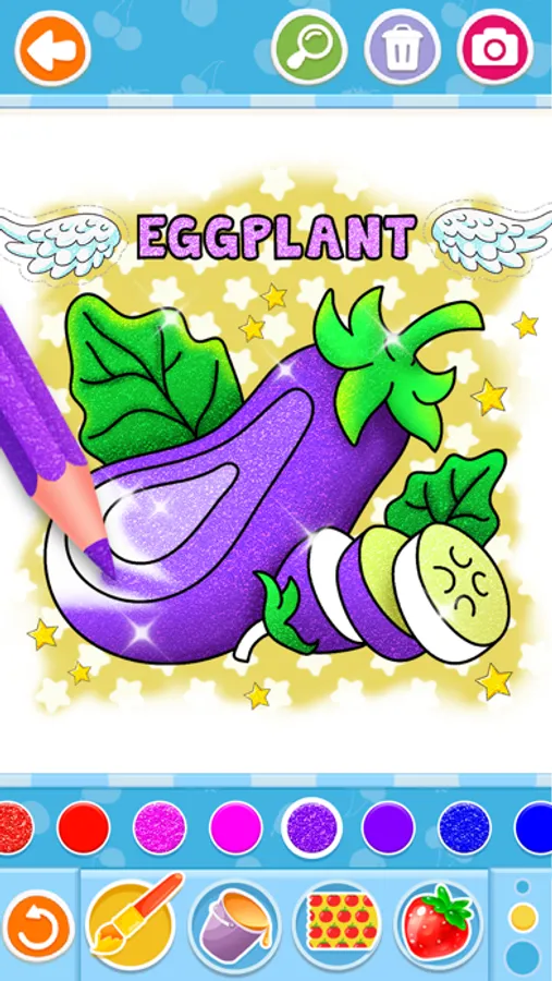 Glitter Fruits and Vegetables Coloring Game for Kids Features: