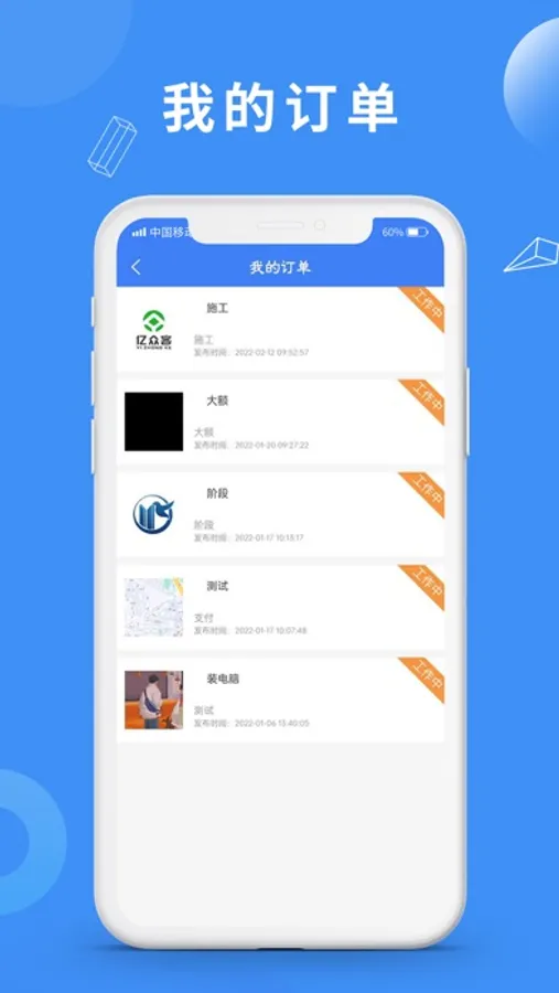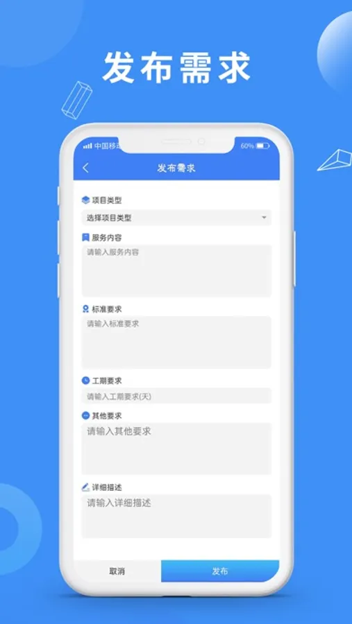 【主要功能】:需求方有需求时,手机发布订单即可坐享上门服务。