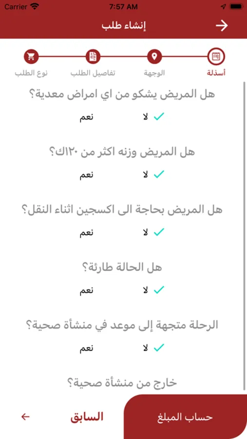 تسعيره واضحه:عند طلب اسعاف للنقل الطبي الغير طارئ ستظهر التسعيره قبل بدء الرحله حتى يتسنى لك معرفة التكلفه بوضوح والتي تعتمد على توقيت ونوع الطلب و المسافه.