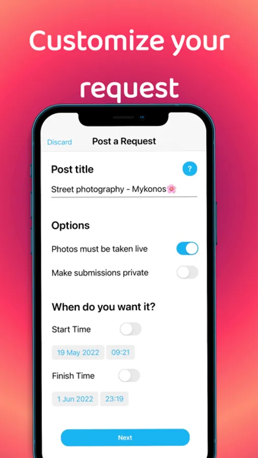 Users can be as specific as they like when requesting their photos. Some of the options available are to choose the location of where the photo is to be taken, what is included in the photo and whether the photo is to be taken on the spot or planned in advance.