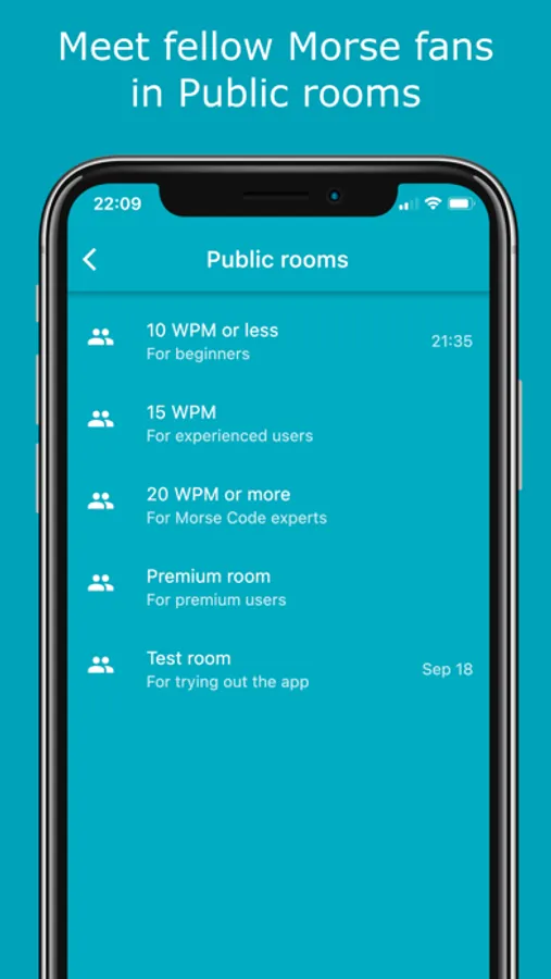 - Public Rooms. A number of rooms (10 WPM or less, 15 WPM, 20 WPM or more, Test room and so on) has been created to allow chatting with fellow Morse code enthusiasts. These rooms are open to everyone. Contact us if you have an idea for a new public room.
