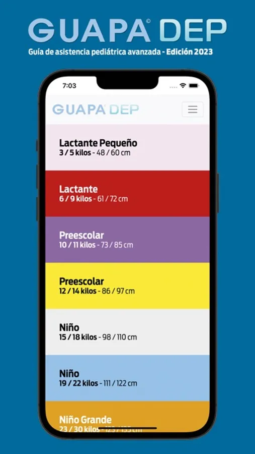 Proporciona grupos de indicaciones terapéuticas según la talla del paciente. En base a la longitud del niño se crean zonas representadas con colores que brindan orientación en la asistencia.
