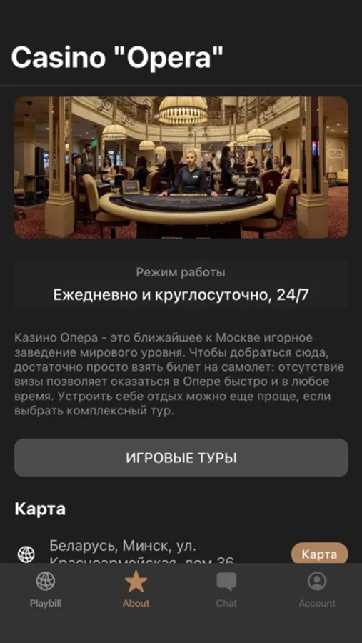 Информационно-развлекательное мобильное приложение предназначено для всех интересующихся и для зарегистрированных гостей казино "Opera.