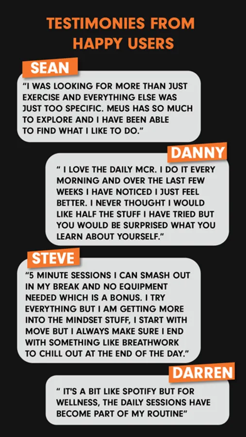 MEUS is a discovery platform built around 5 minute sessions focusing on your fitness and wellbeing. Each unique practice is fully guided by experts of multiple disciplines creating new ways to move, connect & reflect.