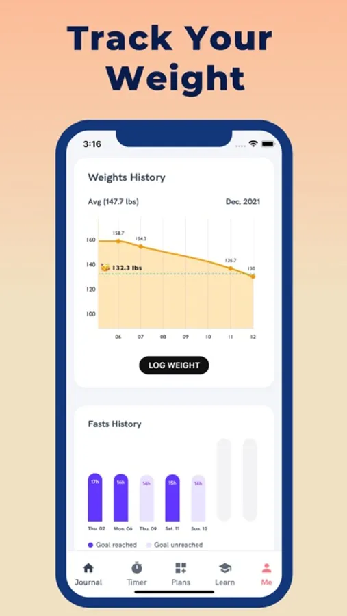Track your progress on the Me screen. View the summary of your stats: total fasts, averaging time, total time, longest fasting, current weight, and total weight loss. You can also see your weight goal, fast history, water intake, how much weight you lose in 7 days, and the Timeline. Get badges for completing tasks and view them on your Achievement tab.
