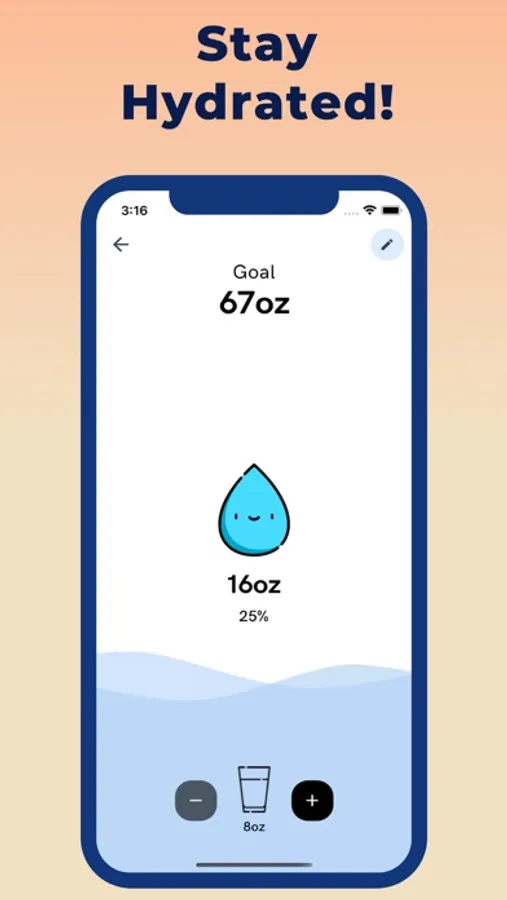 Tap on the water icon whenever you drink water and input your water intake. Track your water intake in the Me tab. Your need for water depends on various factors including if you’re active and how much water you lose (i.e if you sweat a lot you will need more water)