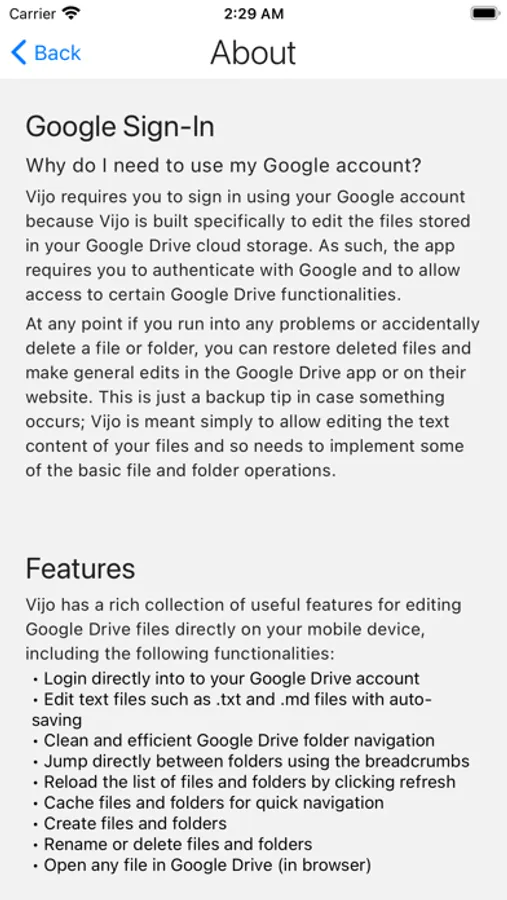 Vijo has a rich collection of useful features for editing Google Drive files directly on your mobile device, including the following functionalities: