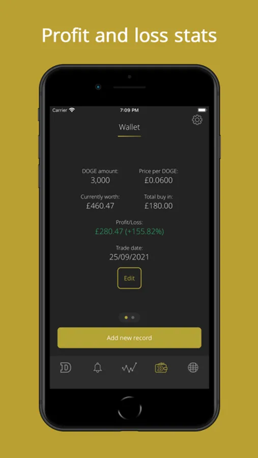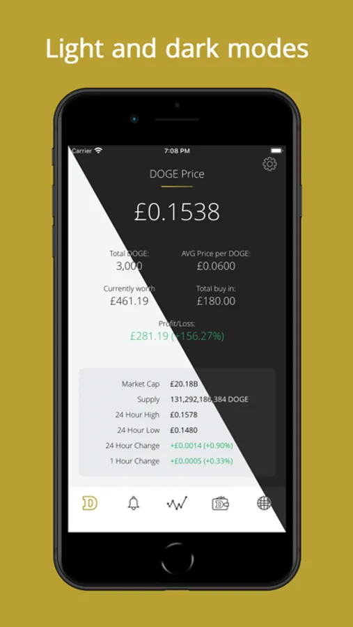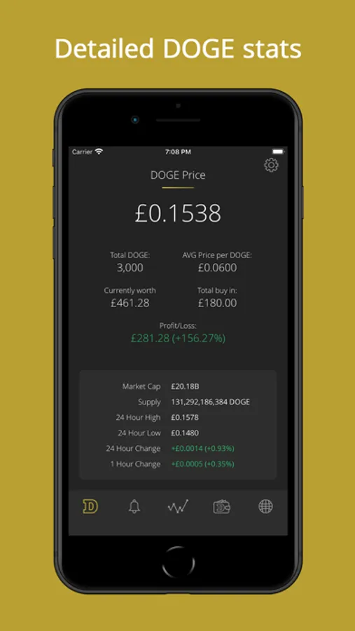 High/low DOGE Alerts (notifications), detailed stats, widgets, news, profit and loss stats and more.