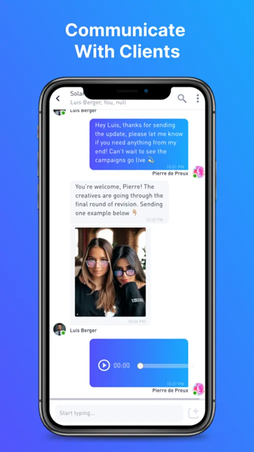 Communicate with clients. Enjoy dedicated private & group chats with clients. Send unlimited messages, share files, and leave voice messages.