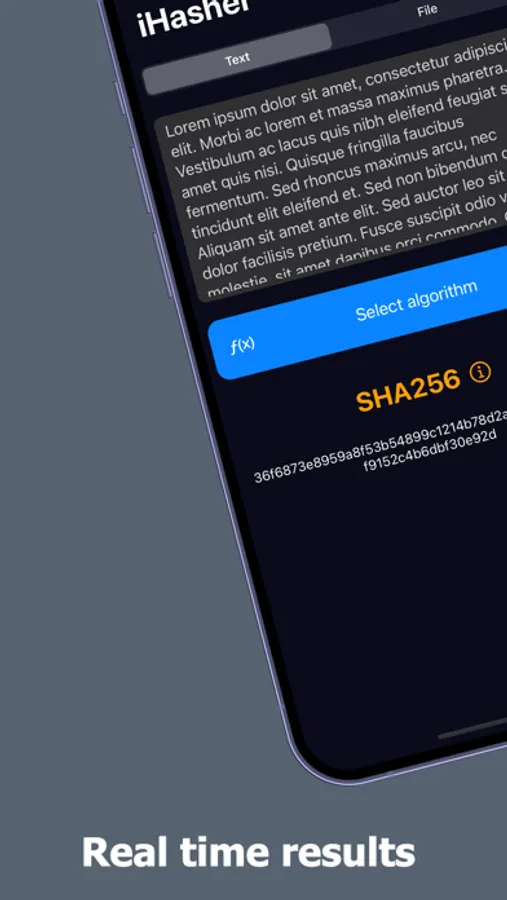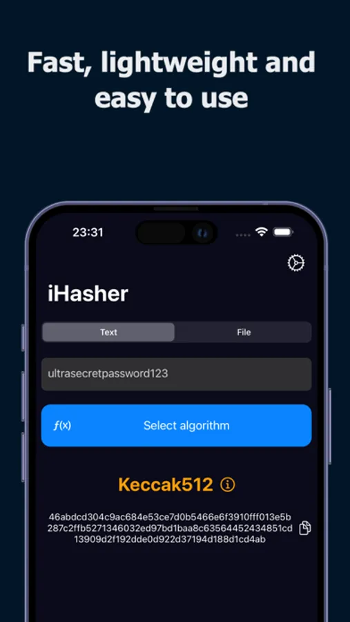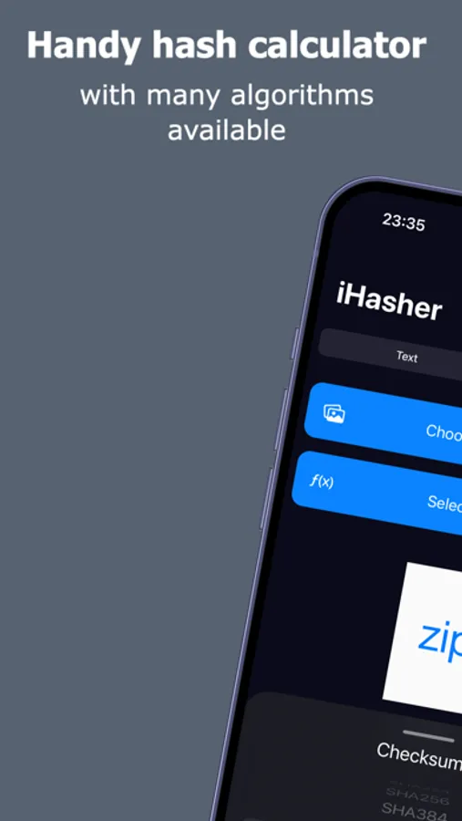 iHasher© is a lightweight and easy to use hash calculator that shows in real time the result of operations with text, images and files almost instantly. Besides text or images you can get the hash value of almost all types of files like documents, media, video, audio, archive (compressed), binary, executable and many others.