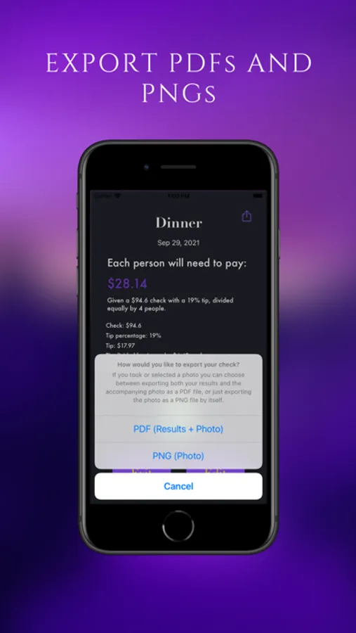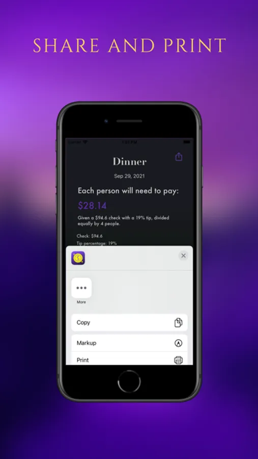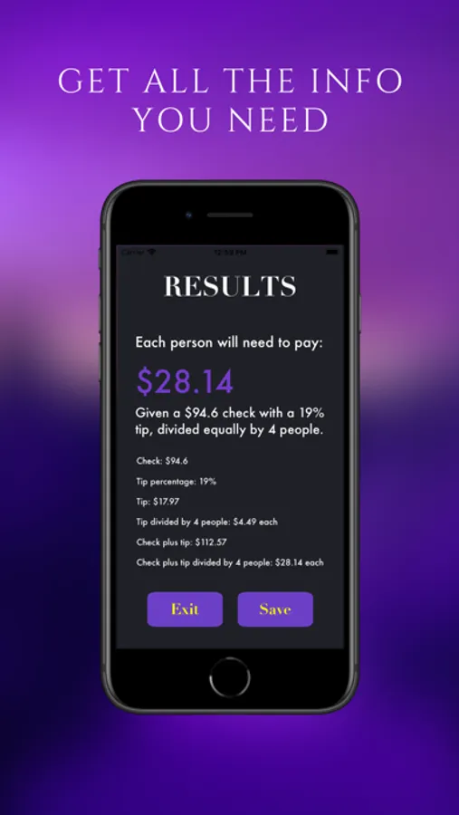 1) How much each person will have to pay (check plus tip divided equally over the number of people you selected).