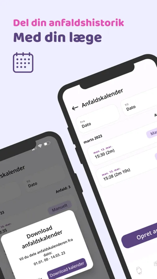 1) Via anfaldskalenderen i mobil-appen, holde styr på de automatisk og manuelt-registrerede anfald. Du har derudover mulighed for at downloade hele din anfaldshistorik og sende det til din læge forud for en patientkonsultation.