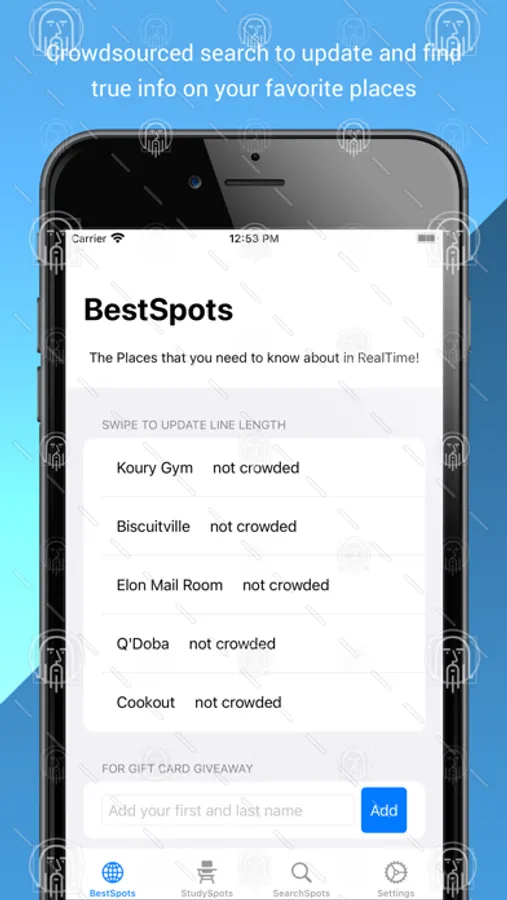 Welcome to BestSpots! This is a mobile app that aims to use crowd-sourced search networks to solve search problems. Currently, we are solving the problem of finding a spot to study on college campuses and getting true information about length of lines of your favorite places. Stay tuned for more updates!