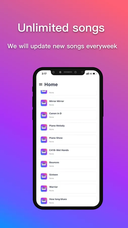 Let's Piano have un limited songs everywhere! we will update songs everyweek! and now you can use this app to play & learn Piano