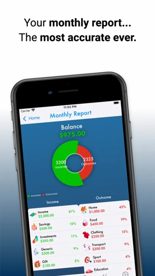You will have the complete control of your finances! With our monthly report you will know the percentage and absolute value composition of your incomes and outcomes... the most accurate ever!
