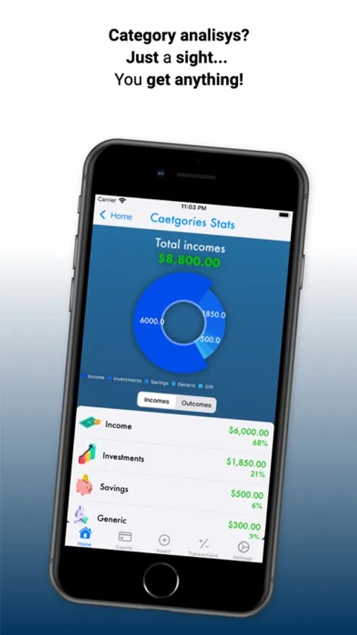 A complete analysis of your transactions. Thanks to categories' global stats you will find out what's your biggest income source e for what you spend more. Just a heartbeat... you will know where to save!