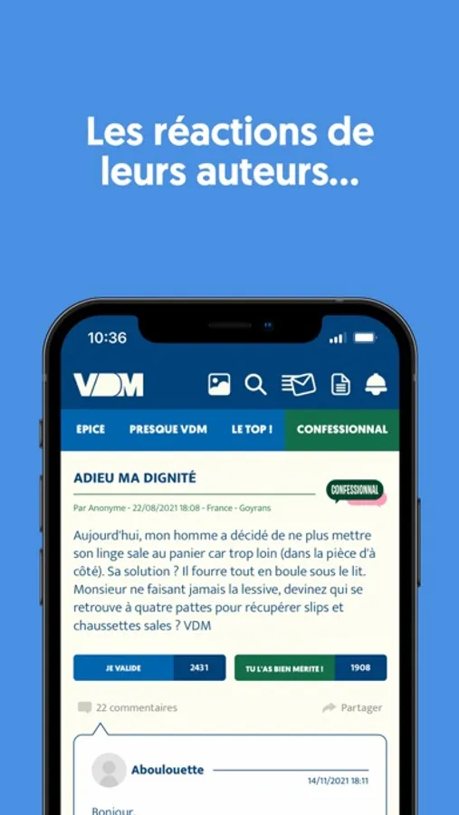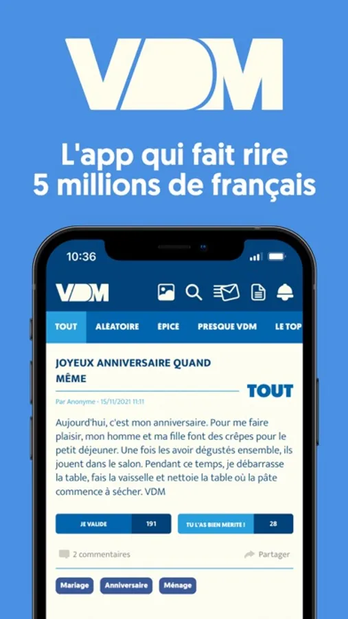 Comme le punk, VDM will never die. Le principe, simple, c'est que tous les jours, notre équipe sélectionne vos galères et les petits moments de honte de nos braves utilisateurs, pour vous les servir sur un plateau (presque) d’argent.