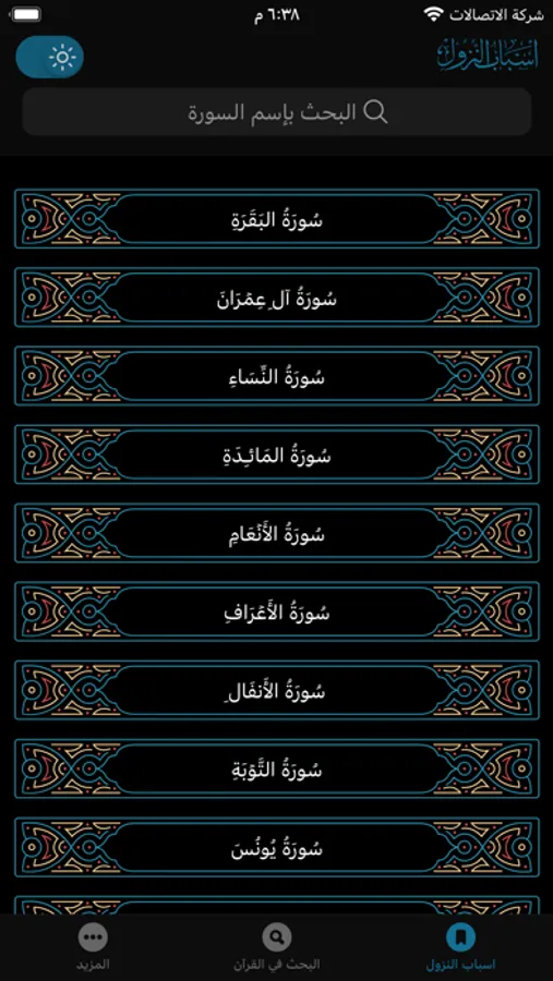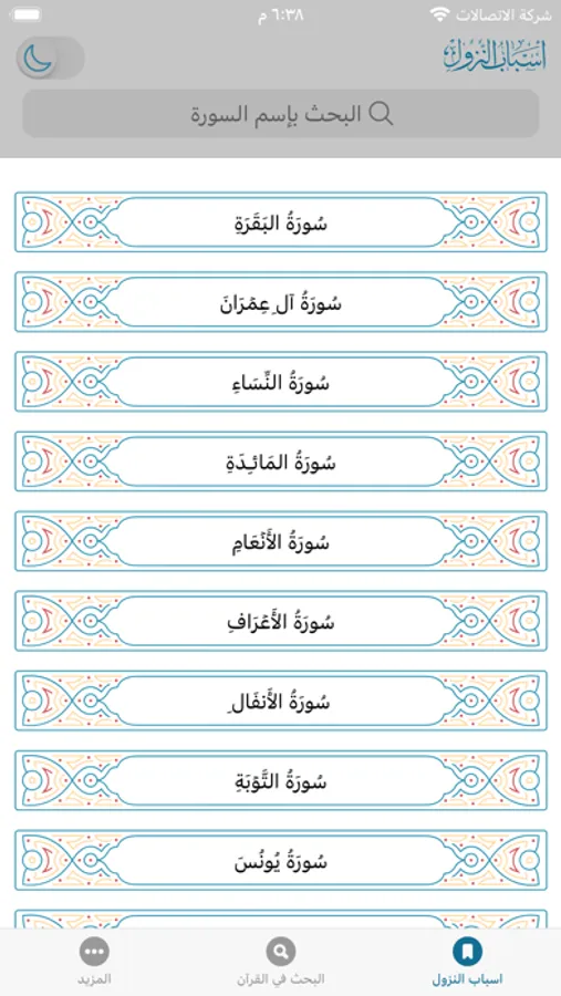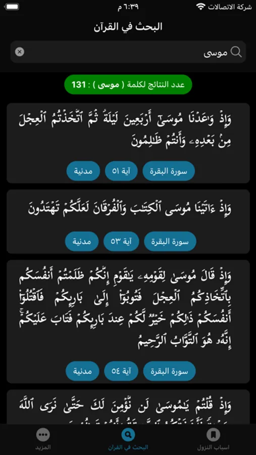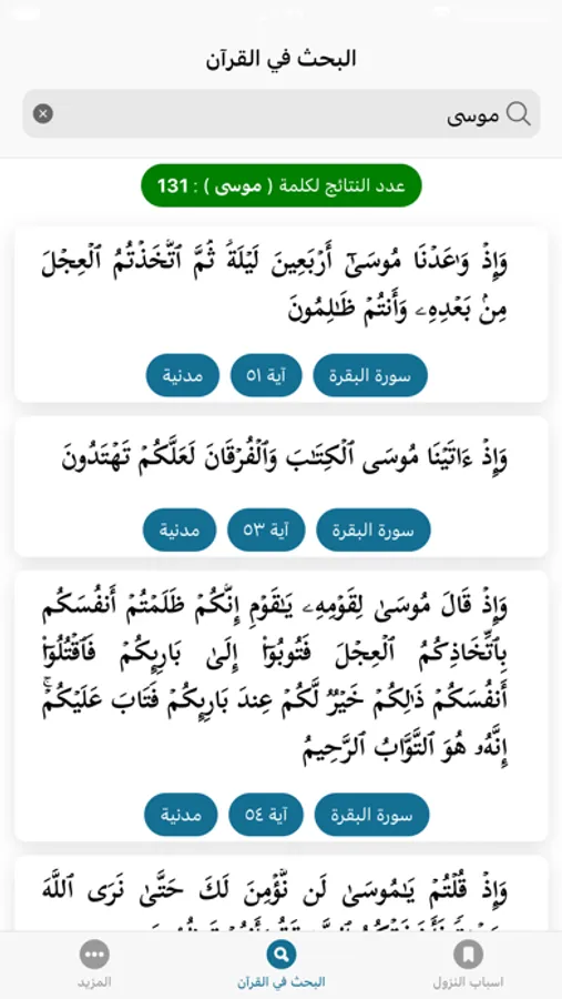 تطبيق أسباب نزول الآيات , يحتوي على قائمة بسور القرآن الكريم بها بعض الآيات وسبب نزولها , يحتوي التطبيق على خاصية البحث عن كلمات في القرآن الكريم , ويحتوي على قائمة بالسور المكية والمدنية