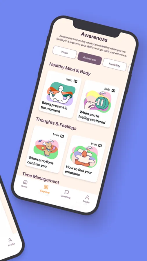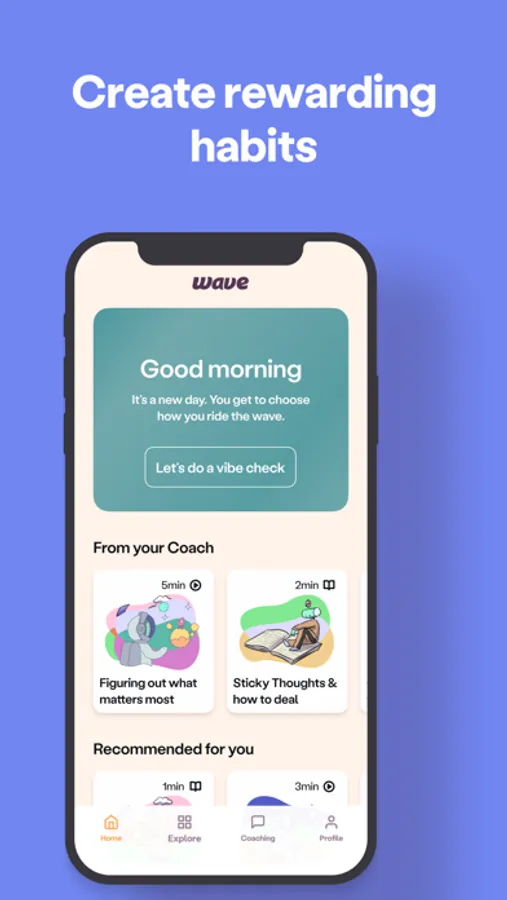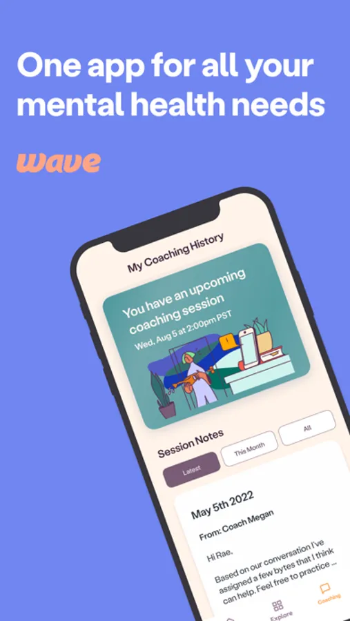 Between coaching sessions, our board certified coaches will provide custom-curated mental health resources and self-guided therapeutic tools. Wave has a growing in-app library of free interactive tools with everything from anxiety-relief games, and self-guided exercises to help you sleep, to therapeutic guided-image activities.