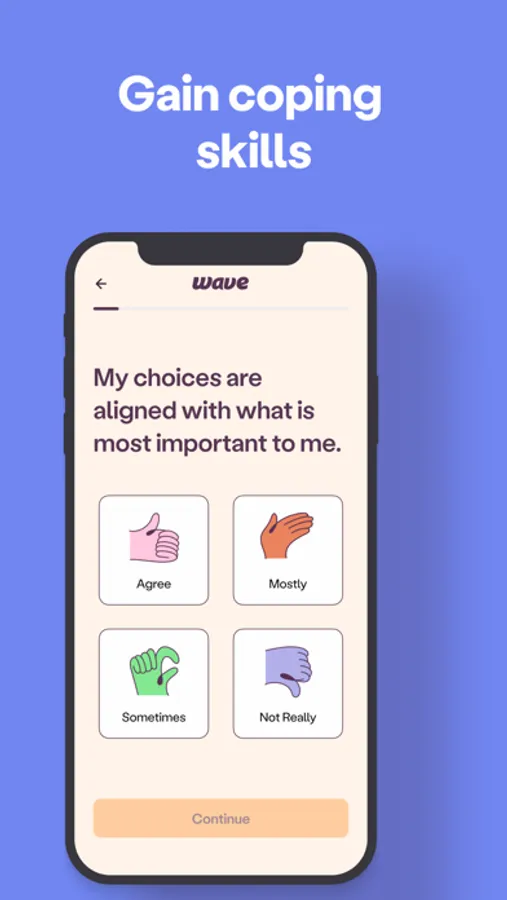 Wave offers mental health quizzes to provide custom recommendations to suit your unique needs. Our mental health quizzes and daily emotional wellbeing check-ins help you track your progress and find helpful resources.