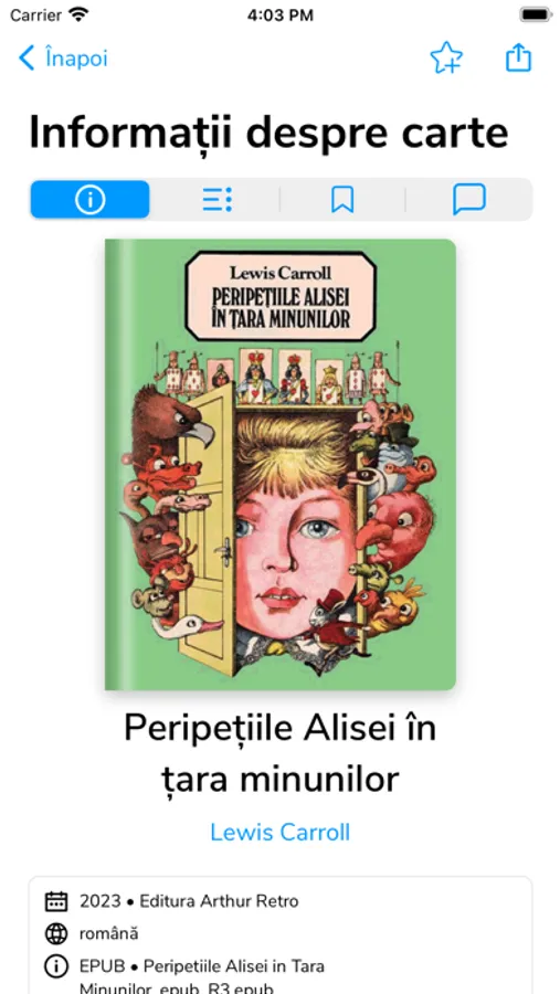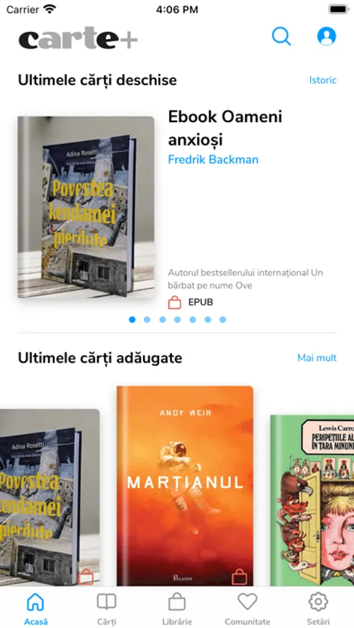 Alege-ți cu o simplă atingere cartea care te interesează și selectează formatul în care vrei s-o citești. Ai și posibilitatea de a adăuga note și evidenția pasajele pe care le crezi importante. Iar dacă întâlnești cuvinte noi, le poți căuta în dicționarul inclus în aplicație. Vino alături de cititorii carte+!
