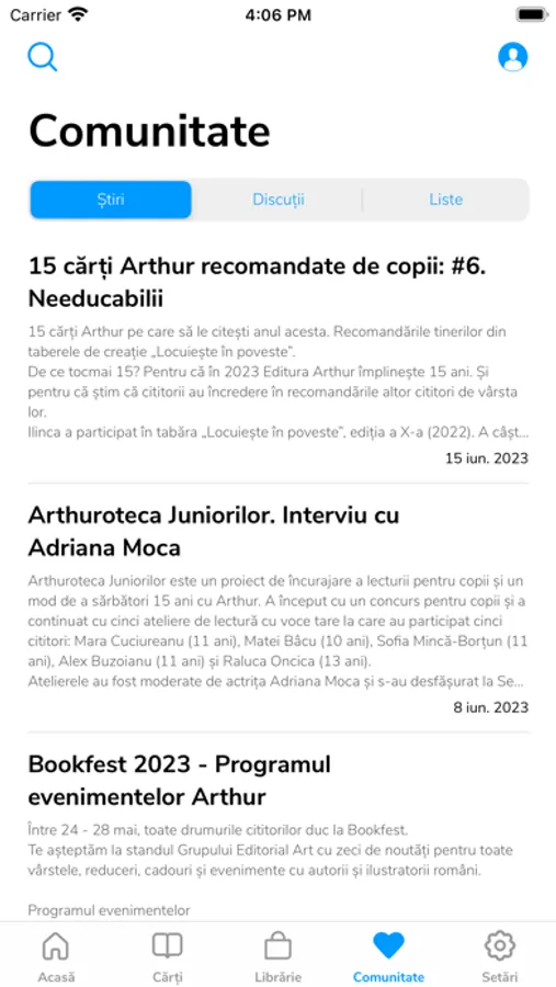 Intră în comunitatea carte+! Aici vei putea să-ți creezi propriile liste de cărți preferate, citite sau pe care vrei să le citești, și să inițiezi discuții despre ele/ pe marginea lor. Descoperi ultimele noutăți ale Grupului Editorial Art și afli opiniile altor cititori despre titlurile care ți-au atras atenția.