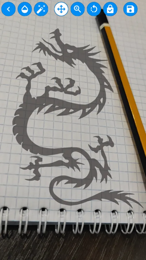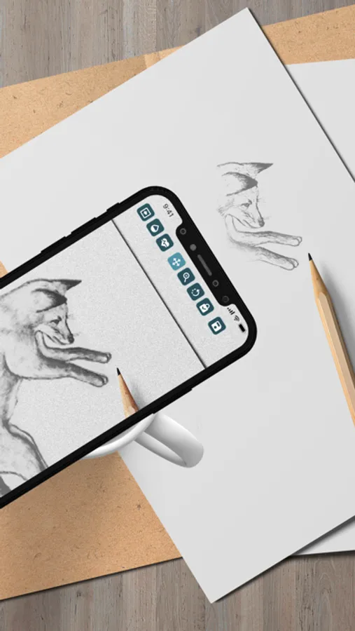To start drawing, point your smartphone camera at a piece of paper. Choose a picture you like from the application catalog or your own phone gallery, it will be superimposed on top of the camera image. Set the necessary transparency and get creative!