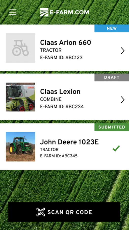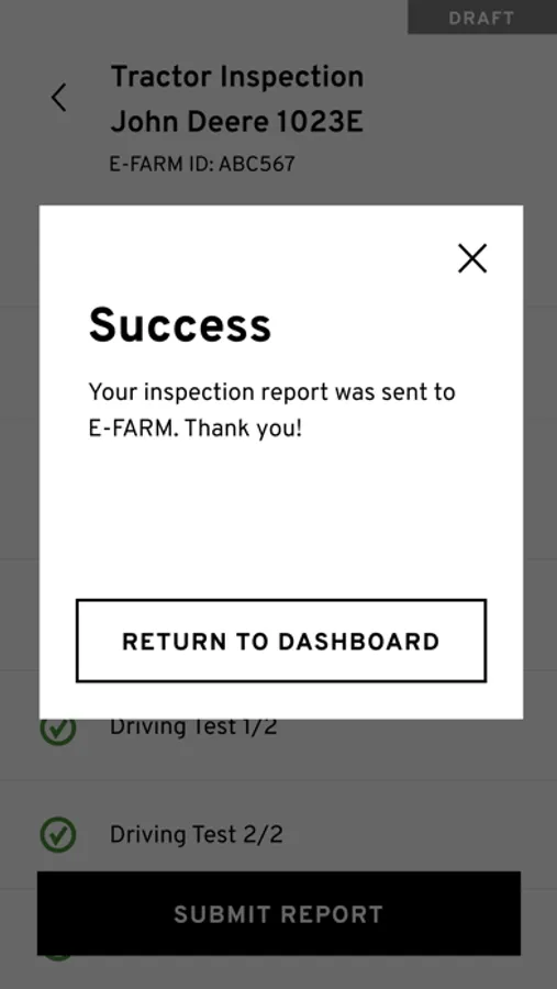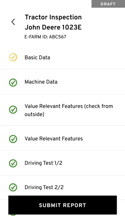 This app enables used farm machinery inspectors to submit official inspection reports directly to E-FARM GmbH.