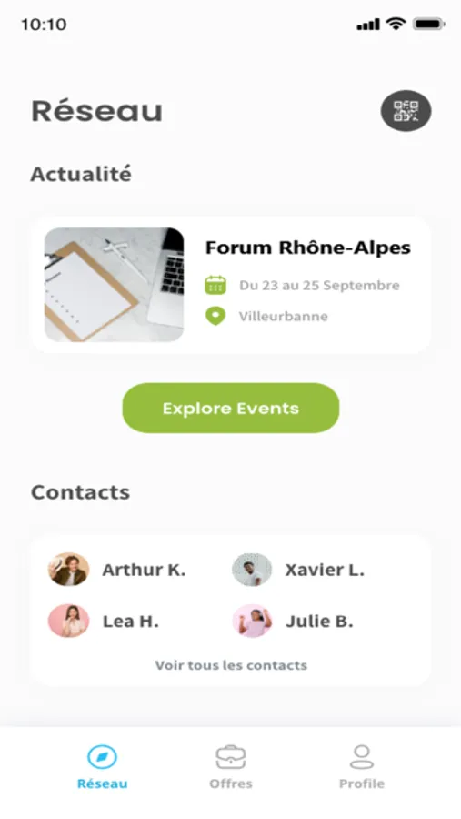 - L'onglet réseau : petite merveille de technologie, il te permet d'avoir toutes les informations sur nos prochains évènements et surtout d'agrandir ton réseau durant nos salons grâce à un échange dématérialisé de tes coordonnées et de ton CV avec les recruteurs de ton choix via un QR code.