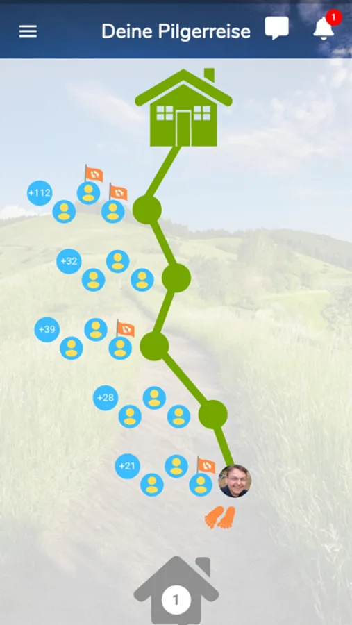 - Tägliche kleine Pilgeretappen von zu Hause werden von der App gemessen. - Fotos & Gedanken mit anderen Pilger:innen teilen