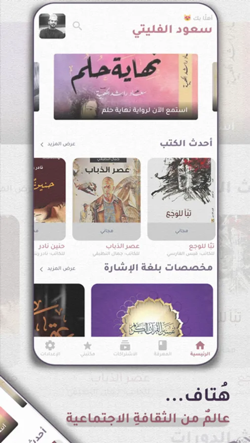 يهدف تطبيق هُتاف لنشر ثقافة القراءة وإكساب المستخدمين مهارات مختلفة من خلال التثقيف عبر مكتبة مليئة بالكتب المتنوّعة. حيث ان تطبيق هتاف يضم عدد كبير من المنتجات الأدبية الثقافية والتعليمية لذلك ستجد في تطبيق هتاف شقين أساسيين من الإنتاج الثقافي الأدبي فالشق الأول عبارة عن مكتبة شاملة للكتب الصوتية والثاني خاص بمواضيع وبرامج لغة الإشارة جاء هذا الجانب ليكون مخصص للأشخاص ذوي الإعاقة السمعية. يبادر طاقم فريق هتاف بإنتاجها بالتعاون مع الكُتَّاب العرب حيث ان جميع الكتب هي كتب تملك حقها القانوني للنشر داخل التطبيق، يقوم الفريق بتسجيل الكتب وتحويلها لكتب مسموعة بطريقة سينمائية روائية ممتعة وحصرية فقط لتطبيق هُتاف. سنوفر في هتاف الكثير من الكتب المختلفة بشتى أنواعها كـ الروايات، والكتب العلمية والتعليمية وكتب لتحفيز الذات وتطوير الفكر وغيرها الكثير.