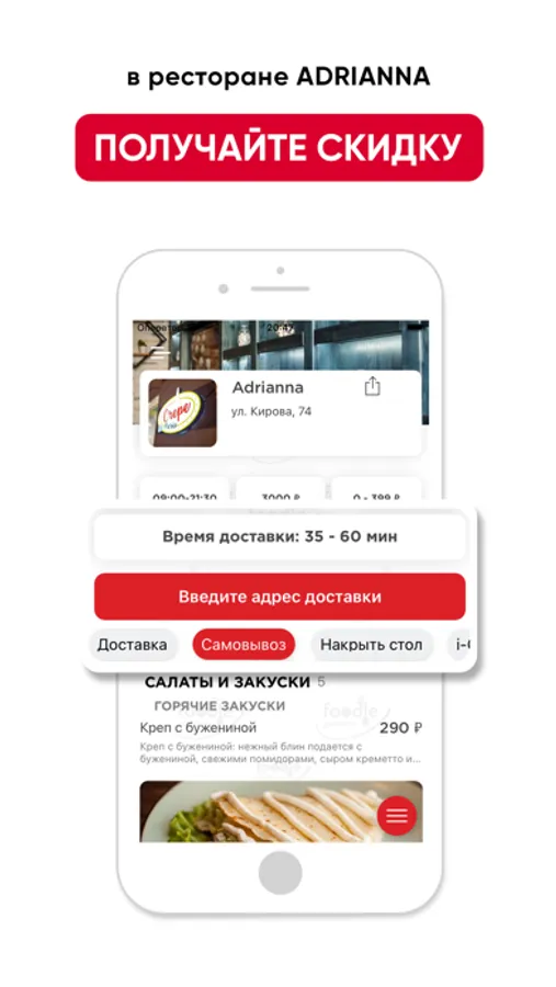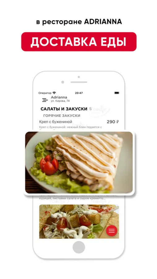 Заказывайте с доставкой: крепы, панкейки, пиццу, сэндвичи, десерты, салаты, горячие закуски, чай, кофе, коктейли, смузи, свежевыжатые соки и напитки.