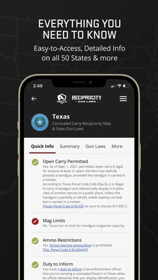 Educate yourself on gun laws for your specific concealed carry permits with a personalized reciprocity map based on your stored permits.
