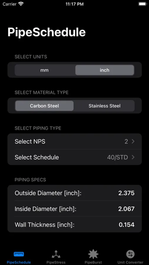 Provides piping specifications (ID, OD and Wall Thickness) for a given NPS and Schedule. Includes both Carbon and Stainless Steel.