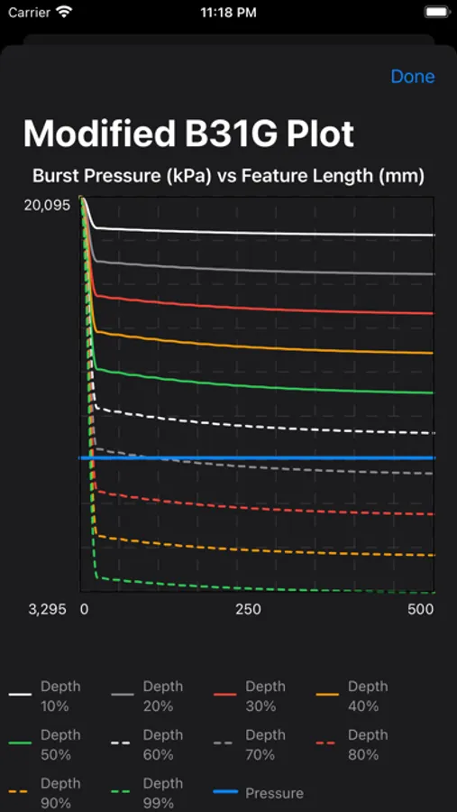 Burst pressure calculator based on the modified ASME B31G equation. Creates Burst Pressure vs Feature Length plot for Feature Depths ranging from 10 to 99%.