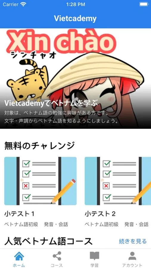 Vietcademyは、ベトナム語コースを探している日本人と専門的高いレベルベトナムネイティブ教師のマッチングでオンラインコースが集まる最大級のベトナム語学習サイトです。アプリから数千もの最新トピックを扱うベトナム語コースをご覧いただけます。ベトナム語の文字、文法、文型、会話、聴解、読解など、幅広いトピックをご用意しています。