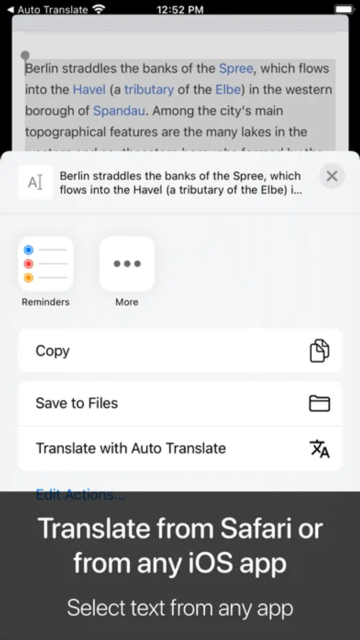 • Translate text from any iOS application using the Share option (emails, documents or messages)