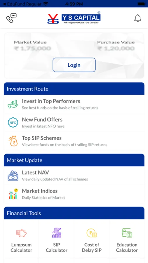 Y S Capital is one-stop shopping for all your Investment needs. You can use this state of the art app to stay on top of your Complete Financial Portfolio with all assets: