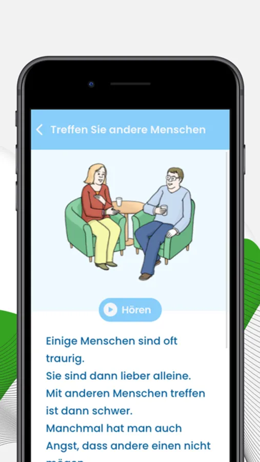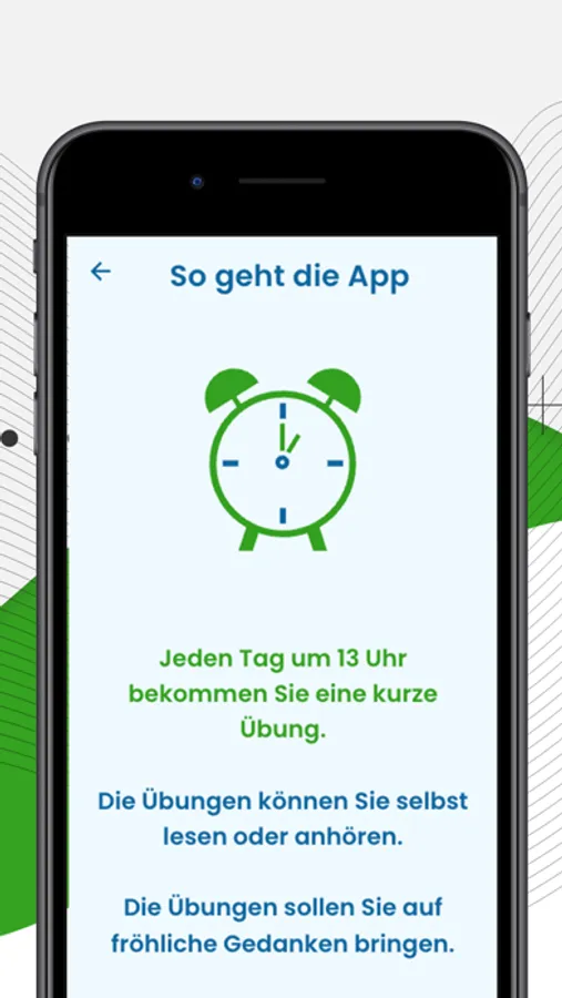 Die App richtet sich an Menschen mit Behinderungen. Die Glücklich App enthält kurze Übungen und ist in leichter Sprache geschrieben (für mehr Information: https://de.wikipedia.org/wiki/Leichte_Sprache). Die Übungen sollen Sie auf fröhliche Gedanken bringen. Jeden Tag erhalten Sie eine neue Übung. Die Glücklich App wurde von der Lebenshilfe Hamburg e.V. und der Arbeitsgruppe Klinische Neuropsychologie entwickelt. Die App befindet sich noch in der Entwicklungsphase.