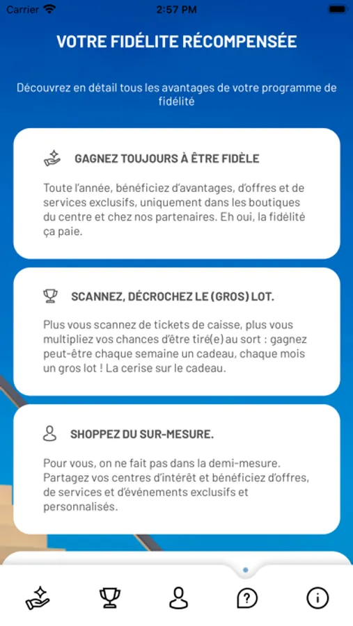 Nous avons conçu une application sur-mesure pour vous assurer une expérience personnalisée. Vous pourrez identifier vos centres d’intérêt et bénéficier d’offres exclusives de vos enseignes favorites.