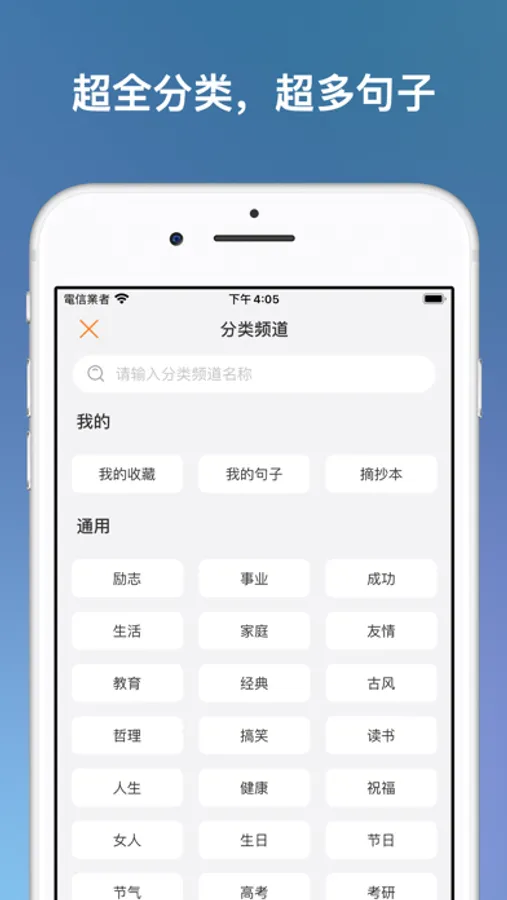 我的收藏、我的句子、摘抄本、励志、事业、成功、生活、家庭、友情、教育、经典、古风、哲理、搞笑、读书、人生、健康、祝福、女人、生日、节日、节气、高考、考研、创业、英文、爱情、表白、思念、暗恋、喜欢你、婚姻、分手、失恋、情话、早安、午安、晚安、开心、幸福、失落、忧虑、伤感、愤怒、晴天、多云、下雨天、下雪天、阴天、时间、今天、明天、未来、星期、月份、季节。