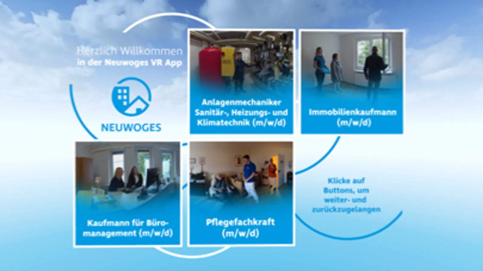 Tauche mithilfe von VR in die Berufswelt von Neuwoges ein und lerne immersiv verschiedene Berufe kennen. Es werden dir die Berufe Pflegefachmann (m/w/d), Anlagenmechaniker (m/w/d), Immobilienkaufmann (m/w/d) und Kaufmann für Büromanagement (m/w/d) vorgestellt.