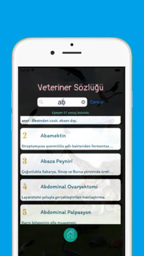 Uygulama aynı zamanda Veteriner sözlüğü de içermektedir. Akıllı arama algoritması ile ihtiyacınız olan sözün anlamını bulabilir veya ilginizi çeken bir konu ile ilgili terimleri araştırabilirsiniz.