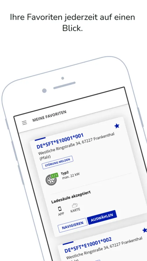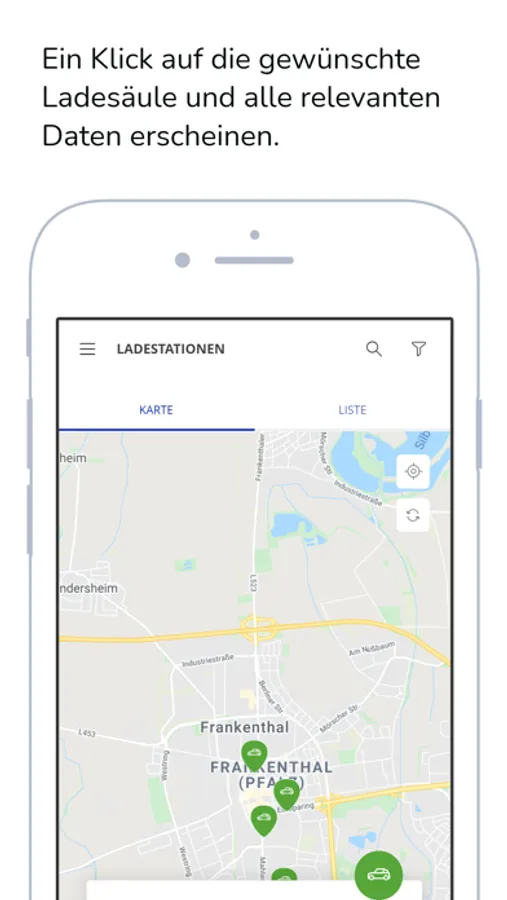 Unsere kostenlose Lade-App ermöglicht es Ihnen europaweit Ladevorgänge zu starten. Sie beinhaltet eine Übersichtskarte mit allen verzeichneten Ladepunkten der Stadtwerke Frankenthal und viele europaweiter Roamingpartner. Zu den mehr als 115.000 verfügbaren Ladepunkten werden die wichtigsten Informationen wie z.B. die aktuelle Verfügbarkeit, Nutzungsgebühren und der zu verwendende Steckertyp übersichtlich angezeigt. Mit der Navigations-Funktion kann der nächste verfügbare Ladepunkt immer schnell gefunden werden. Die Freischaltung des Ladepunkts erfolgt ebenfalls schnell und bequem über die App. Zusätzlich sind Abrechnungsinformationen inklusive Strombezug und Kosten für laufende sowie bereits beendete Ladevorgänge ersichtlich. Sollten Sie es bevorzugen unterwegs eine RFID-Karte zu verwenden, können Sie diese einfach in der App bestellen.