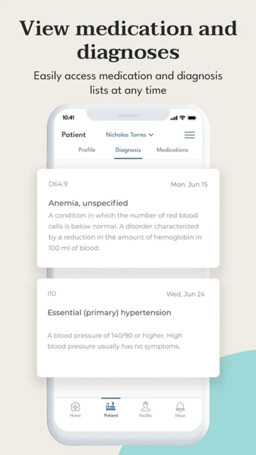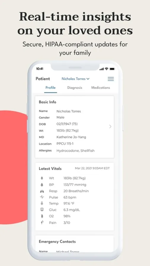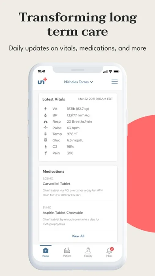 Unio securely integrates into a long-term care’s facility database to share relevant patient info with family members. Our HIPAA compliant technology allows you to receive health updates about your loved one such as recent vital reports, diagnosis, medication lists, and more